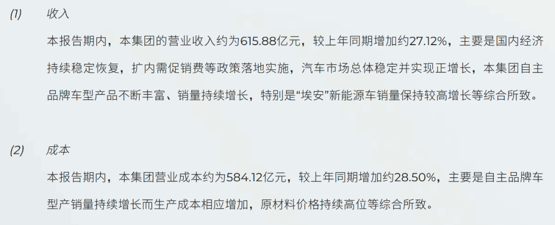 不过,同样是在财报中,有关营业成本同比上涨28.5%的原因,广汽集团对此的解释是“自主品牌车型产销持续增长而生产成本相应增加,原材料价格持续高位等综合所致”。