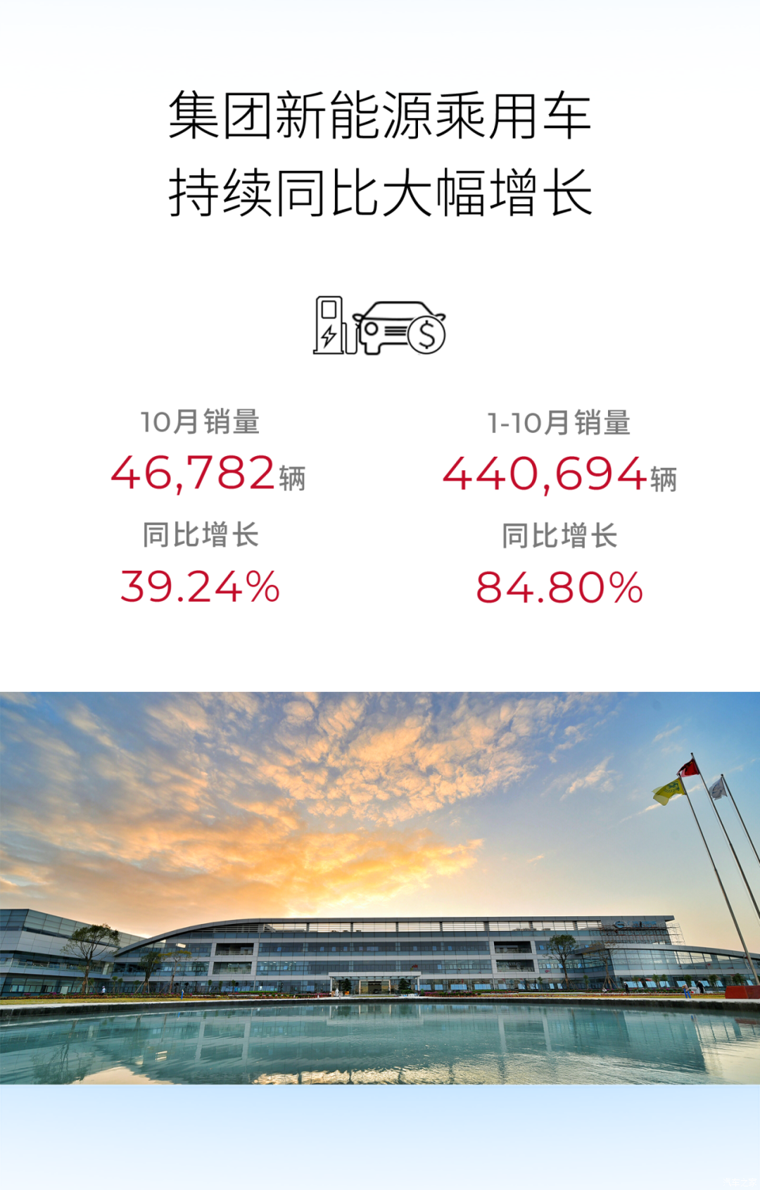 广汽集团新能源乘用车持续同比大幅增长,10月新能源销量达到46782辆,同比增长39.24%,1-10月销量达到440694辆,同比增长84.80%。