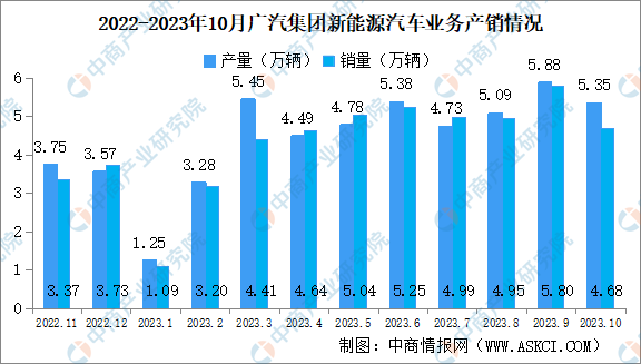 2023年10月,广汽集团新能源汽车产量5.35万辆,同比增长44.03%。2023年1-10月,广汽集团新能源汽车产量45.70万辆,同比增长88.24%。销量4.68万辆,同比增长39.24%。累计销量44.07万辆,同比增长84.80%。