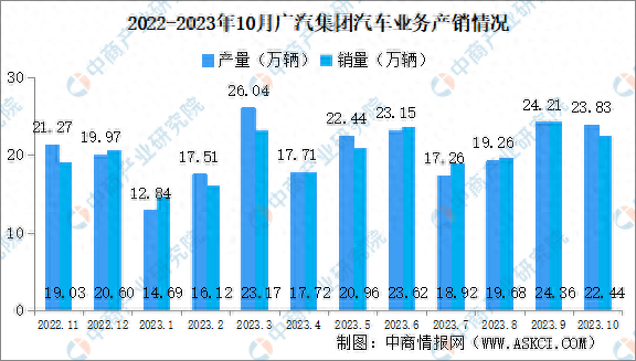 2023年10月,广汽集团汽车产量23.83万辆,同比增长1.46%。2023年1-10月,广汽集团汽车累计产量204.25万辆,同比减少1.21%。销量22.44万辆,同比增长5.65%。累计销量201.87万辆,同比减少0.92%。