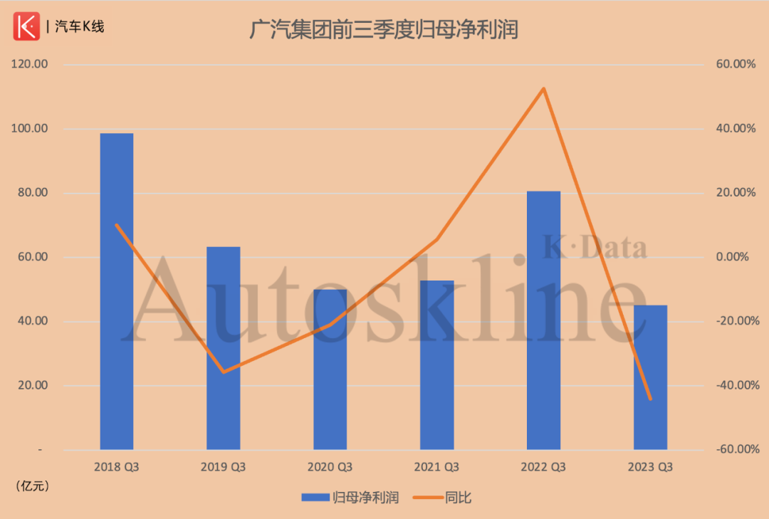 而同期广汽集团归母净利润与扣非净利润分别仅有45.11亿元和40.23亿元,受投资收益骤降影响,上述两项净利润指标同样分别出现44.05%和47.94%的同比下滑,其降幅均创近年之最。