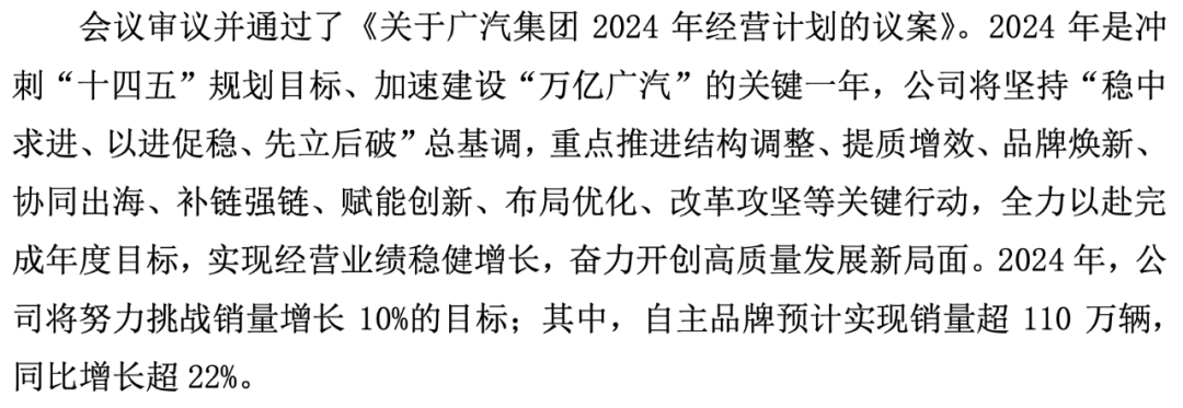 面对2024年,广汽集团设定的目标仍然是产销同比增长10%,其中自主品牌目标增幅22%。