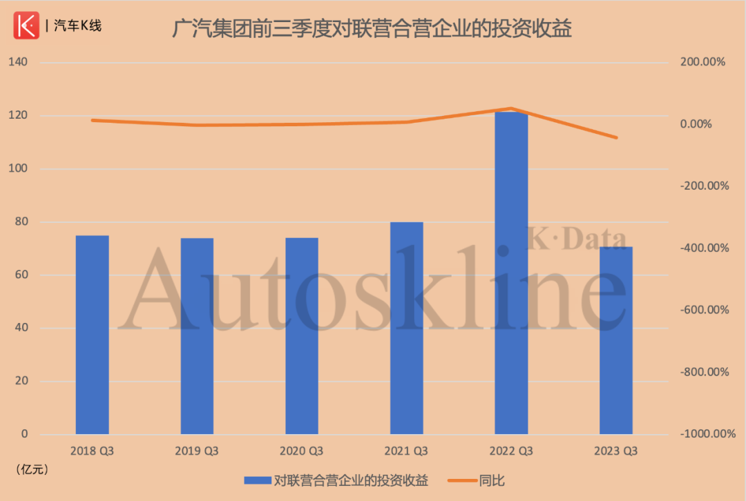 据广汽集团2023年三季报显示,前三季度对联营合营企业的投资收益为70.72亿元,同比骤降41.77%。