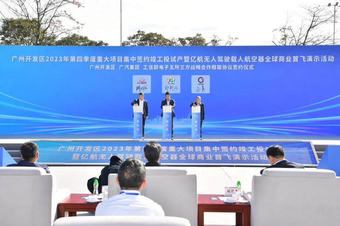 2023年12月28日,广州开发区2023年第四季度重大项目集中签约竣工投试产暨亿航无人驾驶载人航空器全球商业首飞演示活动在广州黄埔知识城成功举行。活动上,广汽集团、广州开发区、工信部电子五所签订三方战略合作框架协议,就抢抓低空经济发展机遇,促进飞行汽车产业发展展开合作。广汽集团董事长曾庆洪、副总经理閤先庆出席活动。
