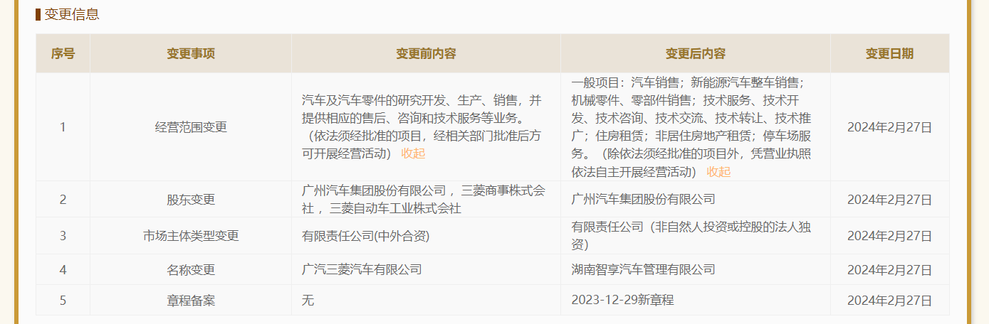 国家企业信用信息公示系统显示,近日,广汽三菱汽车有限公司更名为湖南智享汽车管理有限公司(以下简称“湖南智享”)。同时,三菱商事株式会社、三菱自动车工业株式会社退出股东行列,广州汽车集团股份有限公司(以下简称“广汽集团”)成为湖南智享唯一股东。