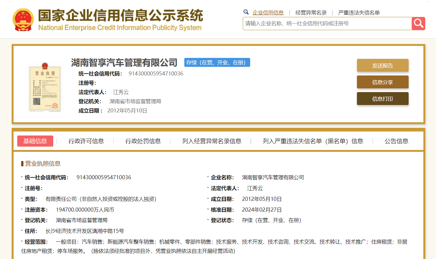 此外,湖南智享的经营范围也进行了变更,取消了汽车生产这一核心业务,新增新能源汽车整车销售、住房租赁、停车场服务等业务。