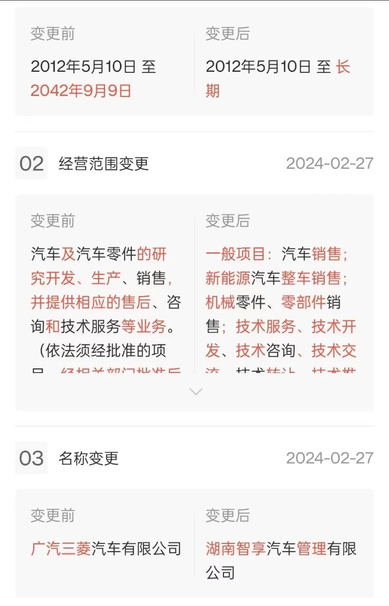 同日,三菱商事株式会社、三菱自动车工业株式会社退出股东行列。同时,湖南智享的业务范围也有所变更,不再有汽车生产这一核心业务,而是新增新能源汽车整车销售、停车场服务等项目。