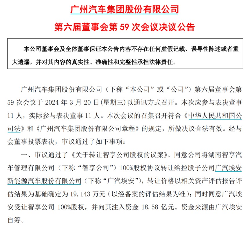 3月20日,广汽集团董事会通过一项决议,同意将湖南智享汽车管理有限公司(智享公司)100%股权转让给旗下的广汽埃安。