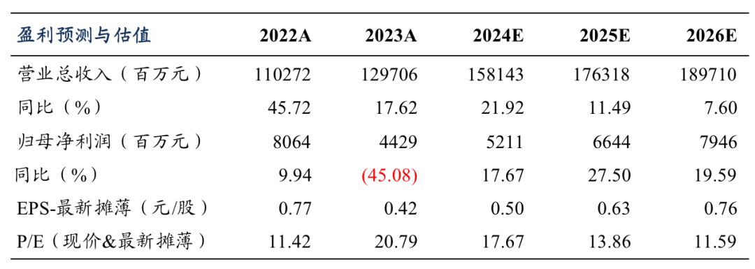 自主能源生态产业链实现闭环布局:公司聚焦“XEV(混动化)+ICV(智能网联)”和“EV(电动化)+ICV(智能网联)”,全面提升自主创新能力,2024年全年力争实现自主品牌销量超100万辆。合资品牌电动转型加速,产品组合持续优化。我们维持公司2024/2025/2026年归母净利润预期为52.1/66.4/79.5亿元,对应PE为18/14/12倍。维持“买入”评级。