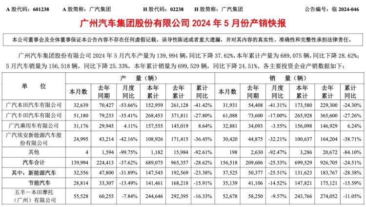 数据显示,2024年5月,广汽集团汽车产量为139,994辆,同比下降37.62%,本年累计产量为689,075辆,同比下降28.62%;5月汽车销量为156,518辆,同比下降25.33%,本年累计销量为699,529辆,同比下降24.51%。