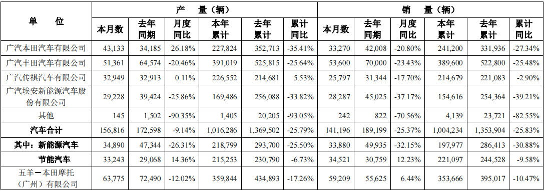 广汽埃安新能源汽车股份有限公司7月产量同比下降25.86%至29,228辆,累计产量同比下降33.82%至169,486辆。7月销量为28,287辆,同比下降37.17%;今年累销154,616辆,同比下降39.21%。