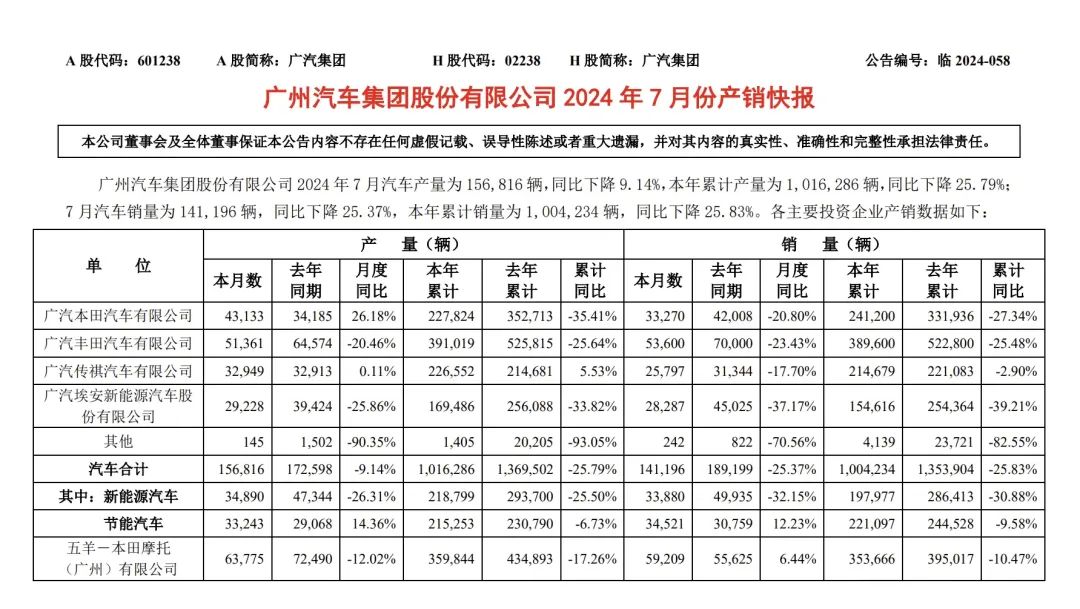 近日,广汽集团发布7月份销量快报,数据显示,7月广汽集团销量141196辆,同比下滑25.37%;1-7月累计销量为1004234辆,同比下滑25.83%。