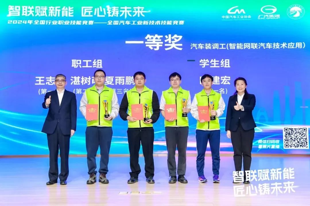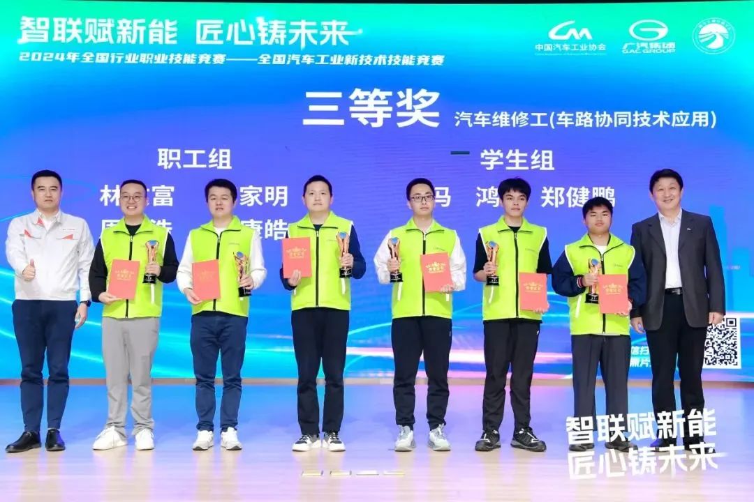 组委会对在竞赛中取得优异成绩的选手进行了表彰。来自广汽埃安的王志伟、来自广州市交通技师学院的谭佳庆分别获得汽车装调工(智能网联汽车技术应用)赛项和汽车维修工(车路协同技术应用)赛项职工组第一名,来自广州市交通技师学院的欧建宏和郭家豪分别获得两个赛项学生组第一名。