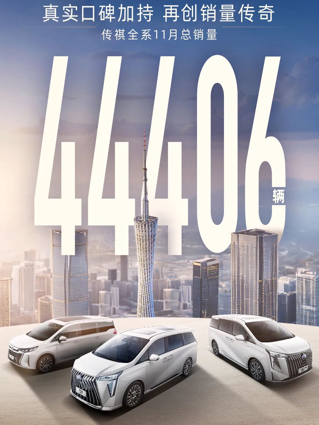 广汽传祺11月销量为44,406辆,同比增长19.3%、环比增长26.3%。其中传祺MPV家族月销17,240辆,同比上涨26.6%、环比上涨54.9%;全球累计销量突破70万辆,成为销量最快达成70万的中国MPV品牌。此外,传祺影系列月销18,146辆,其中GS3影速销量12,251辆,同比上涨59.5%、环比上涨371.2%;传祺SUV系列月销8389辆,同比增长24.5%。