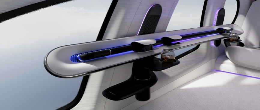 在座舱设计方面,GOVY AirJet的内饰呈现未来感十足的“太空舱”风格,采用简洁流线的设计,配有高端商务舱的舒适座椅布局,同时引入了“灵动功能集成浮岛”,集成了无线充电、氛围灯和音响等豪华配置,提升了乘客的感官体验。座舱顶部设计了“像素银河”星空顶,进一步增添了飞行中的沉浸感。