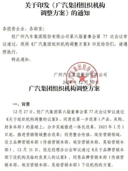 近日,广汽集团发布公告,经广汽集团第六届董事会第77次会议审议通过集团将整合传祺、埃安的营销领域,设立品牌营销本部,负责传祺、埃安、昊铂的大客户业务,并统筹市场营销、整车销售、渠道建设、售后服务和新媒体营销等工作。这一调整自2025年1月1日起实施,财务本部、采购本部、产品本部下设的"室"统一更名为"部"。
