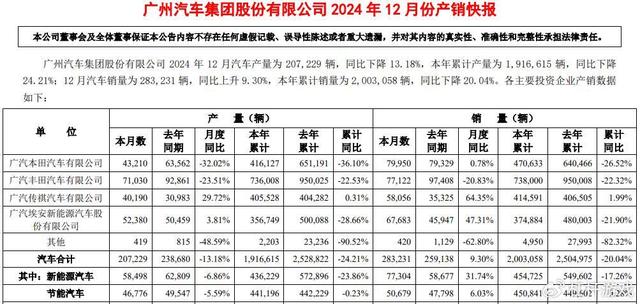 根据产销快报,2024年12月,广汽集团汽车销量28.32万辆,同比增长9.30%。但是全年销量200.31万辆,较上年同期的250.50万辆,减少约50万辆,同比下滑20.04%。