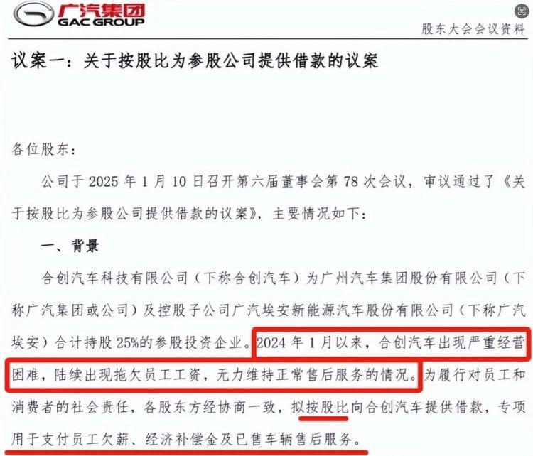 不过这一次是确凿的信息,因为是来自合作方广汽集团的披露,其表示合创汽车已经经营困难、拖欠工资、无力维持售后。于是股东们商议,拟按照股权比例,借笔钱给合创汽车,值得一提的是这笔钱,只能用于支付员工欠薪、经济补偿及已售车辆售后服务。此外,广汽埃安将接管合创汽车产品的售后服务工作。