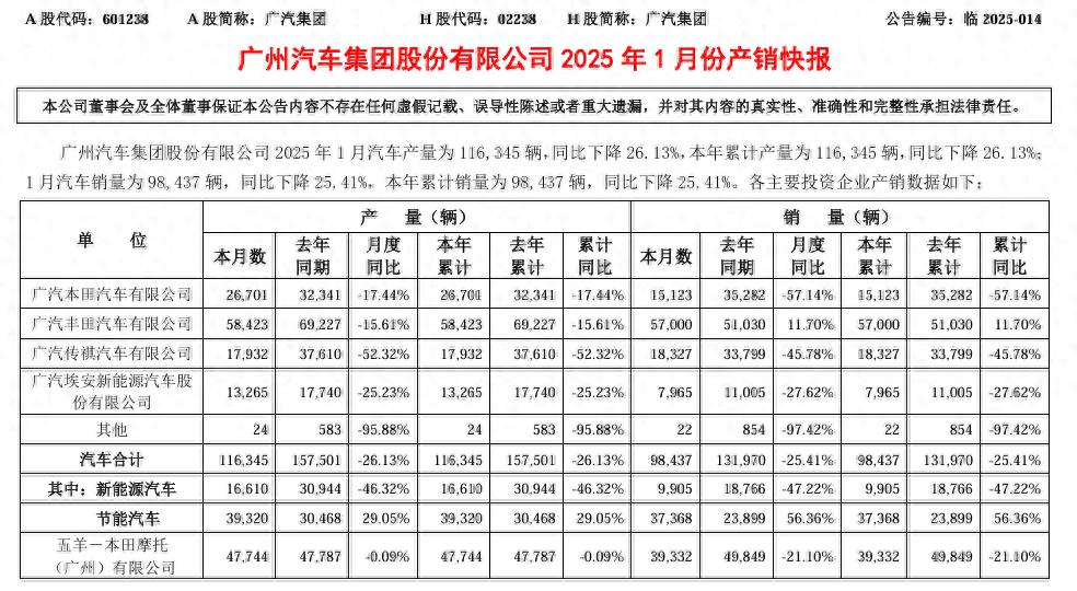 IT之家 2 月 9 日消息,广汽集团昨日公布 2025 年 1 月份产销快报。2025 年 1 月汽车产量为 116,345 辆,同比下降 26.13%;1 月汽车销量为 98,437 辆,同比下降 25.41%。