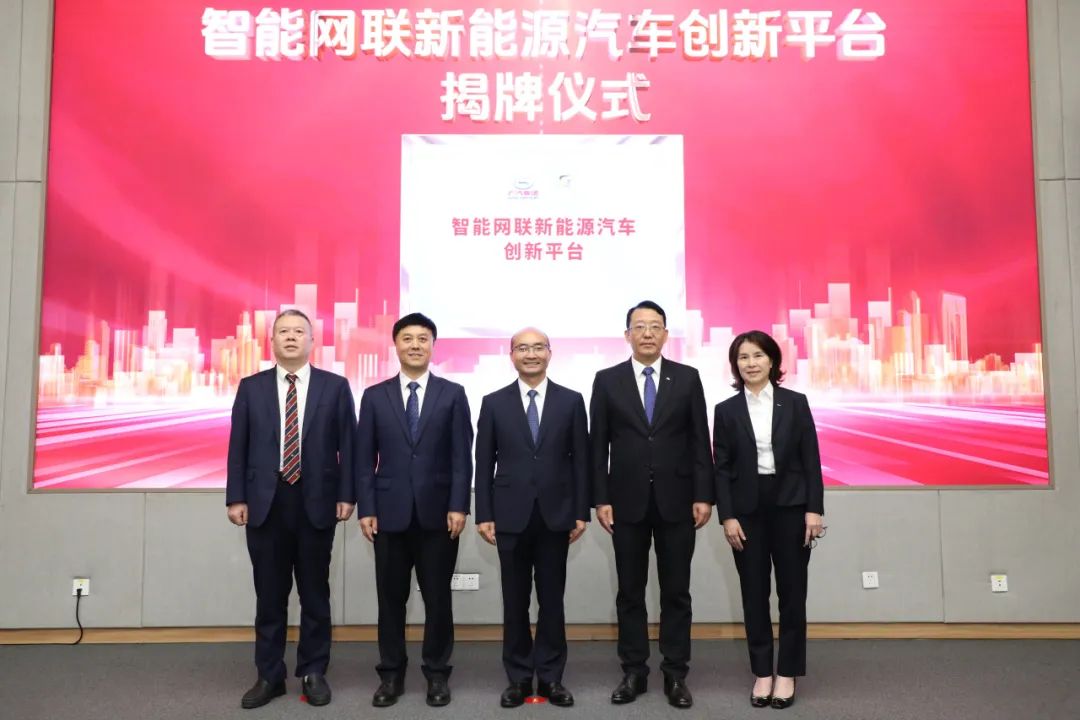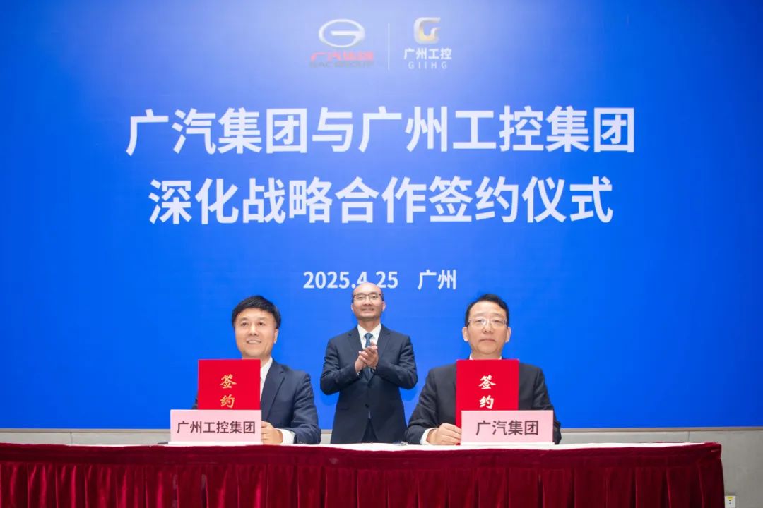 广汽集团董事长冯兴亚、广州工控集团董事长景广军代表双方签署协议,广州市国资委主任梁凌峰见证签约,市工信局代表出席活动。