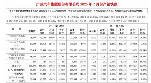 8月8日,广汽集团发布2025年7月产销快报,数据显示当月集团汽车销量为11.95万辆,同比下降15.38%。1-7月累计销量87.48万辆,同比下降12.89%,经营压力持续加剧。