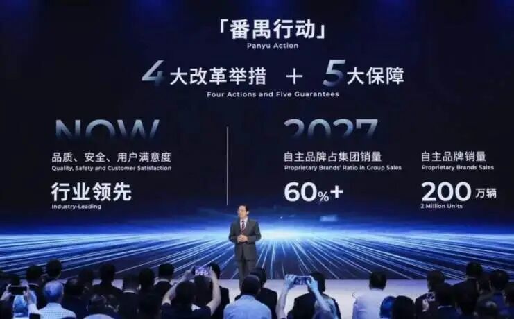 作为广州汽车界“全村的希望”,一年前的11月15日,时任广汽集团总经理的冯兴亚,发布了雄心勃勃的自主品牌三年规划——“番禺行动”,即到2027年实现自主品牌销量占集团总销量的60%以上,并挑战自主品牌销量突破200万辆。
