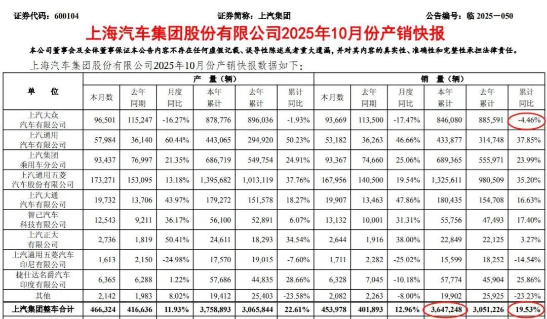 去年还被嘲笑“老登”的上汽集团,今年打了个漂亮的翻身仗。集团10月份销售整车45.40万辆,同比增长12.96%;1-10月上汽集团销量364.72万辆,同比大增19.53%。除上汽大众累计同比微跌4.46%外,上汽通用、上汽乘用车、上汽通用五菱、上汽大通、智己等品牌纷纷实现同比增长。