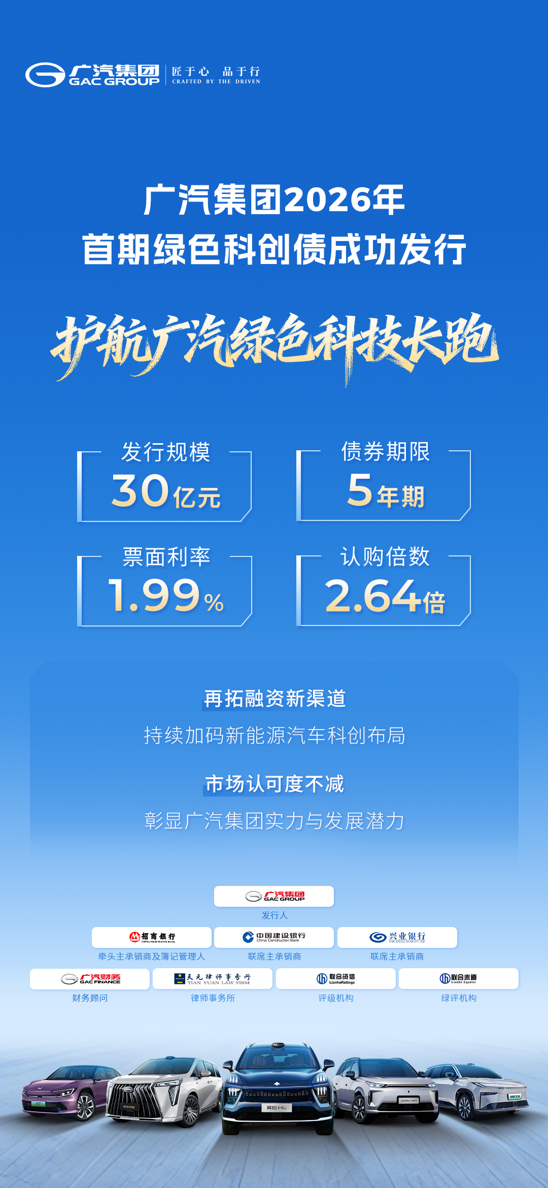 广汽集团2026年首期绿色科技创新债券成功发行!募集资金已于2026年1月16日全部到账,30亿元资金注入绿色科技赛道,债券期限5年期,票面利率1.99%,2.64倍认购倍数彰显市场热捧。