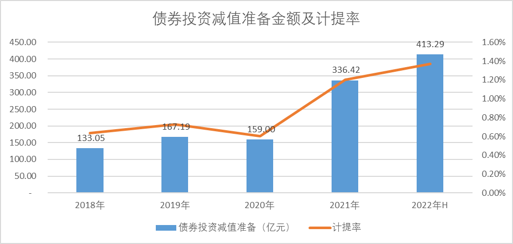 从风险角度来看,平安的债券投资并不理想,债券投资减值准备金额由2018年的133.05亿增长至2022年半年报413.29亿。除了债券投资规模增加导致的绝对值增加外,计提率增长也十分明显,由2018年的0.64%增长至2022年1.37%,债券投资风险在外部坏境压力下逐渐放大。