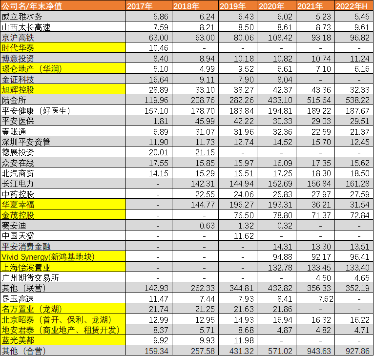 图:近五年平安长期股权投资名单,来源:企业年报,单位:亿元