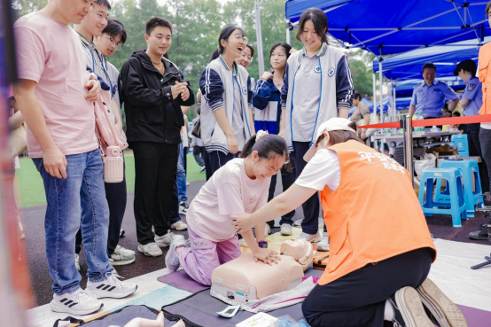 同样备受追捧的,还有安全急救演练区。平安义警志愿者陈晓燕的现场教学,被家长和孩子们围得水泄不通。她不仅生动演示了心肺复苏的全过程,还手把手指导大家操作AED设备。“开机、贴片、分析、除颤——每一步都关乎生命,”陈晓燕一边讲解,一边鼓励体验者动手尝试,“希望大家都能学会这项技能,关键时刻能伸出援手。”现场观众民在轻松愉快的氛围中学到实用技能,纷纷为“平安义警”的专业与热情点赞。