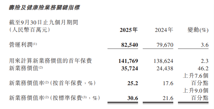 2025年前三季度,中国平安寿险及健康险业务新业务价值强劲增长46.2%;代理人人均新业务价值同比增长29.9%;银保渠道新业务价值同比增长170.9%。
