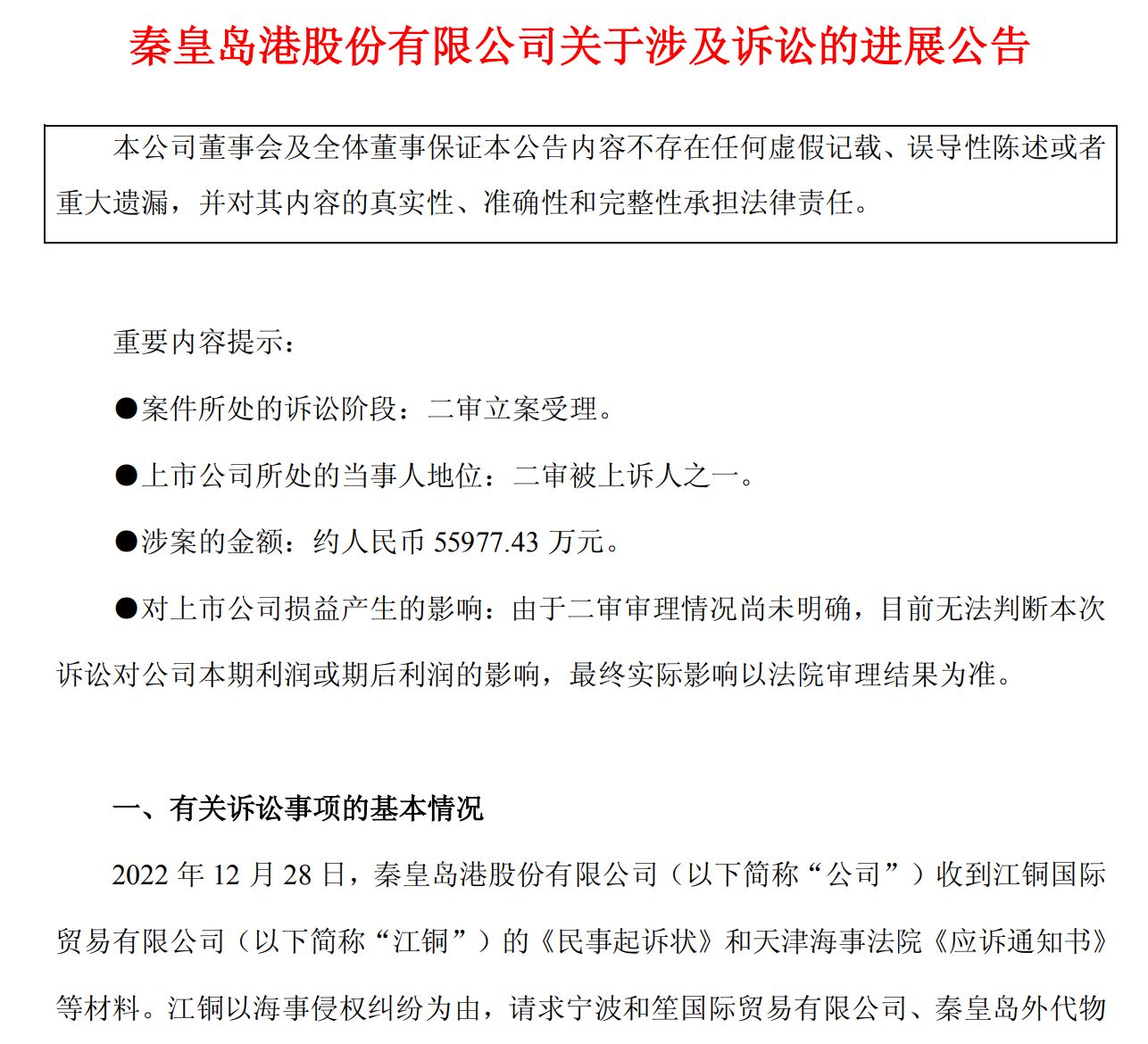 2025年11月12日晚间,秦港股份披露最新进展称,上诉人江铜公司不服天津海事法院作出的一审裁定,向天津市高级人民法院提起上诉,天津市高级人民法院已立案。涉案金额从此前的7.83亿元降至约5.6亿元。