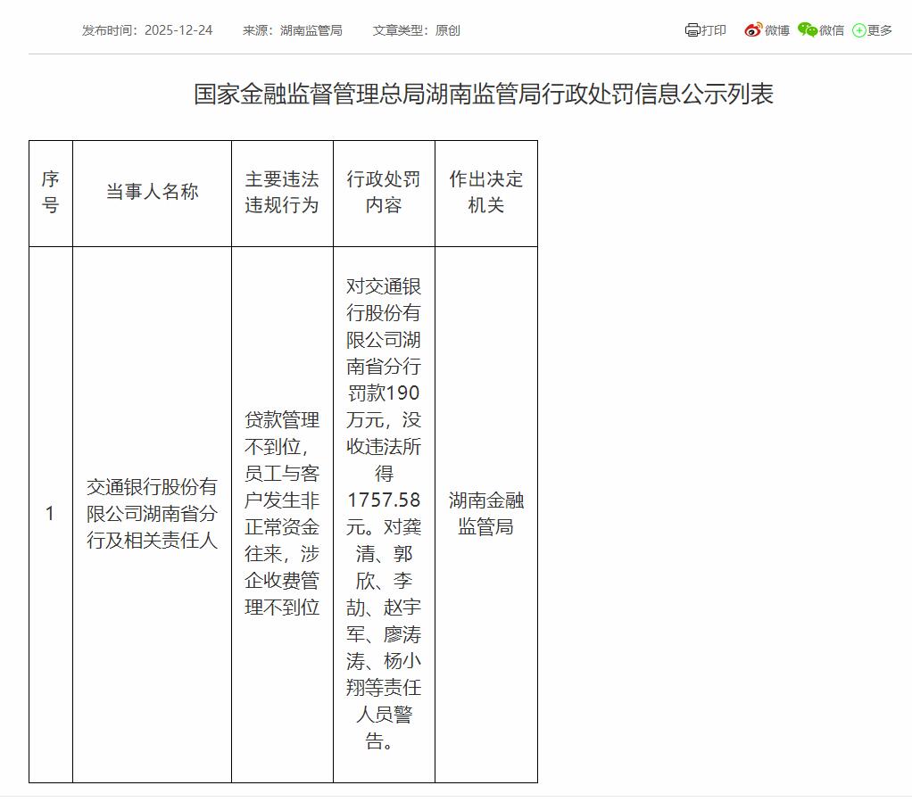 国家金融监督管理总局网站近日发布的湖南监管局行政处罚信息公示列表显示,交通银行股份有限公司湖南省分行及相关责任人贷款管理不到位,员工与客户发生非正常资金往来,涉企收费管理不到位。