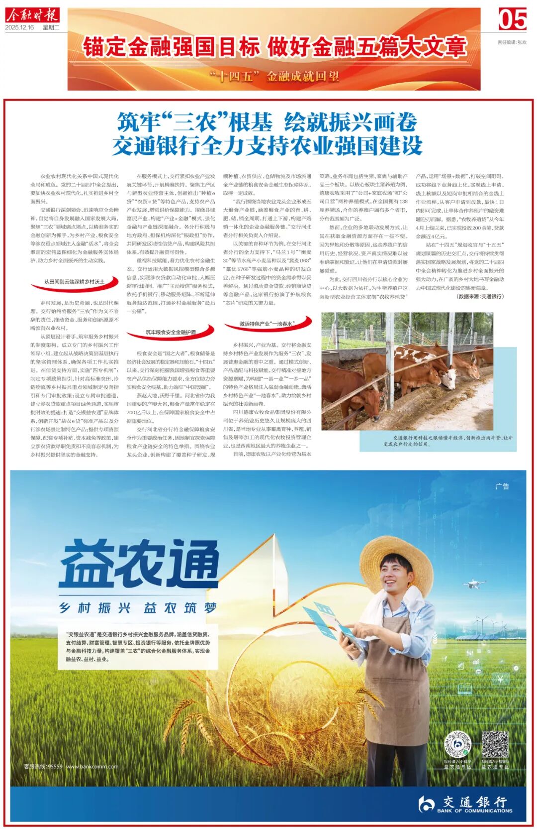 近日,《金融时报》刊发《筑牢“三农”根基绘就振兴画卷交通银行全力支持农业强国建设》报道,介绍了交通银行深刻领会、迅速响应二十届四中全会精神,自觉将自身发展融入国家发展大局,聚焦“三农”领域痛点堵点,以精准务实的金融创新为抓手,为乡村产业、粮食安全等涉农重点领域注入金融活水,将全会擘画的宏伟蓝图细化为金融服务实体经济、助力乡村全面振兴的生动实践。