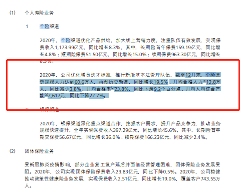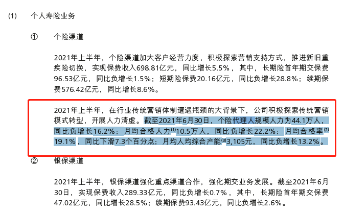 而新华保险2021年半年报显示,截至今年6月30日,新华人寿的个险代理人规模人力为44.1万人,同比减少16.2%;较2020年12月末的60.6万人减少16.5万人。