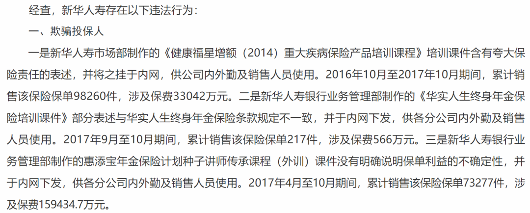 处罚决定书指出,新华保险市场部制作的《健康福星增额(2014)重大疾病保险产品培训课程》培训课件含有夸大保险责任的表述,新华保险却将之挂于内网,供公司内外勤及销售人员使用,2016年10月至2017年10月期间,新华保险累计销售该保险保单98260件,涉及保费3.3亿元。