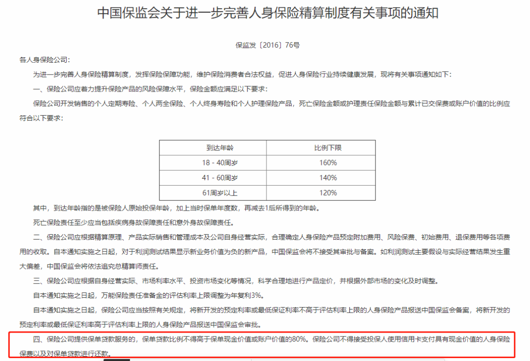 不过,红星资本局注意到,2016年9月,原保监会就发布了《中国保监会关于进一步完善人身保险精算制度有关事项的通知》,其中第四条指出,“保险公司不得接受投保人使用信用卡支付具有现金价值的人身保险保费以及对保单贷款进行还款。”