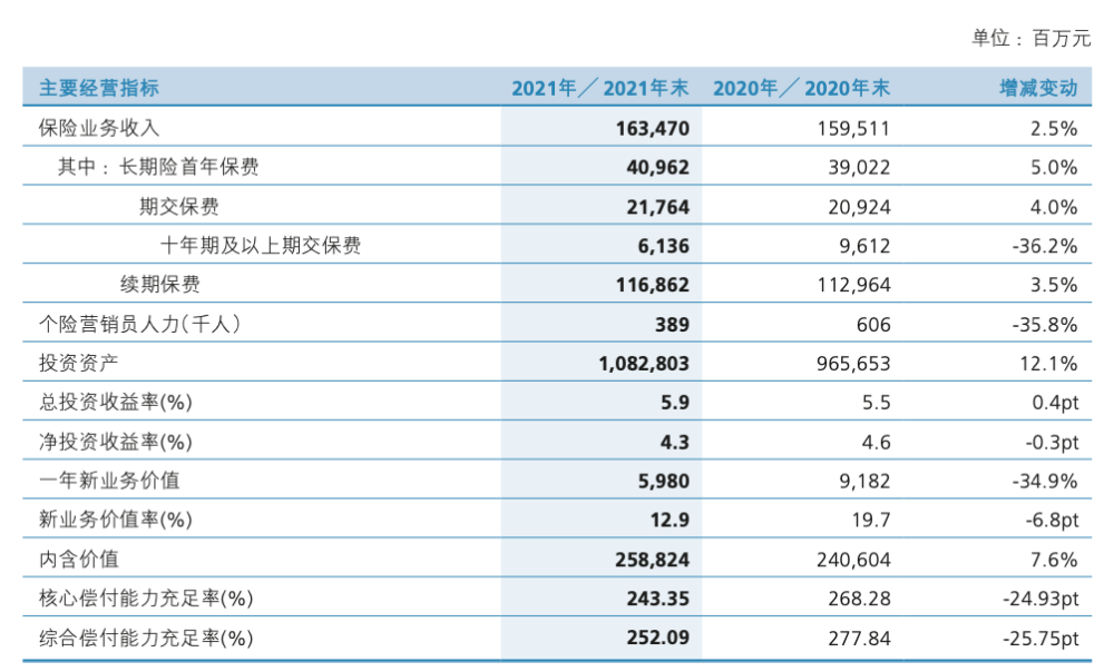 从新华保险2021年年报来看,截至2021年底,总保费收入近1635亿元,同比增长2.5%;新业务价值59.8亿元,同比下降34.9%;新业务价值率12.9%,同比下降6.8个百分点。其中,个险新业务价值57.8亿元,同比下降35.7%。