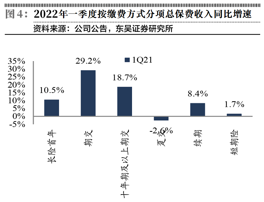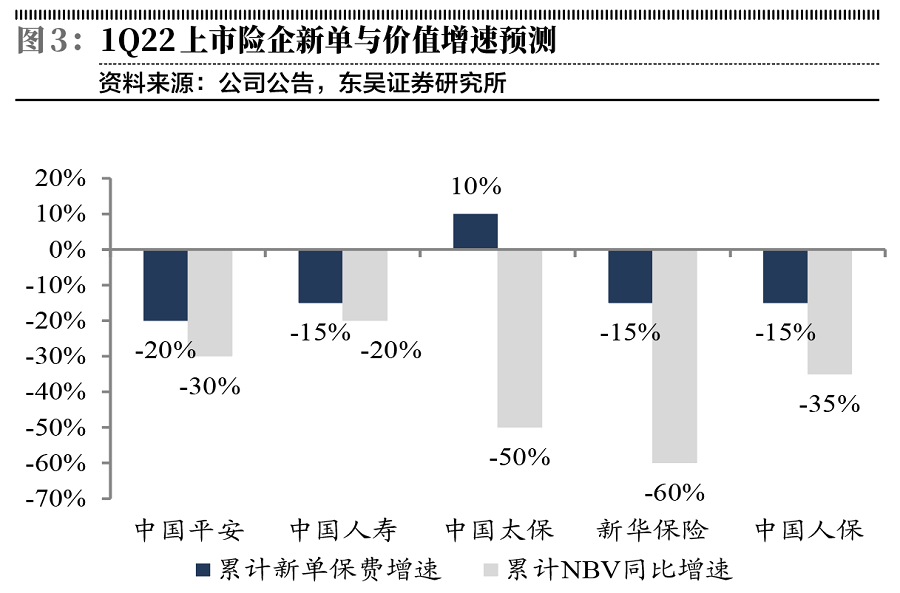 2022年一季度,疫情全国各地散发拖累新单复苏节奏,预计一季度新业务价值(NBV)同比降幅逾六成。2022年以来,全国各地疫情散发,叠加同期因新旧定义重疾切换使得新单和价值基数较高,上市险企平均NBV降幅逾三成。2021年一季度,新华保险长期险首年保费同比增长10.5%(十年期及以上期交保费同比逆势增长18.7%),基数较高。3月中旬以来,在极低同期基数和队伍规模边际企稳作用下,行业单月新单有底部企稳改善迹象,仍需观察有效人力企稳和改善的持续性。