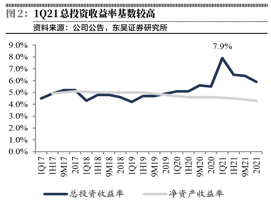 2021年一季度,新华保险主要受益于投资资产买卖价差收益增加,公司实现投资收益195.58亿元,同比增长57.8%;主要由于市场波动带来可供出售金融资产公允价值变动,其他综合收益税后净额为-42.18亿元,上年同期为-15.26亿元。新华保险一季度年化总投资收益率为7.9%,同比增长2.8个百分点,表现突出。
