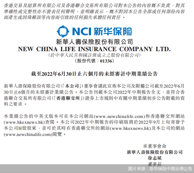 8月30日,新华人寿保险股份有限公司(以下简称“新华保险”)发布中期业绩公告显示,截至2022年6月30日,新华保险实现归属于母公司股东的净利润51.87亿元,实现保费收入1025.86亿元,同比增长2.0%,其中,长期险首年保费294.86亿元,长期险首年期交保费122.30亿元,续期保费702.12亿元。