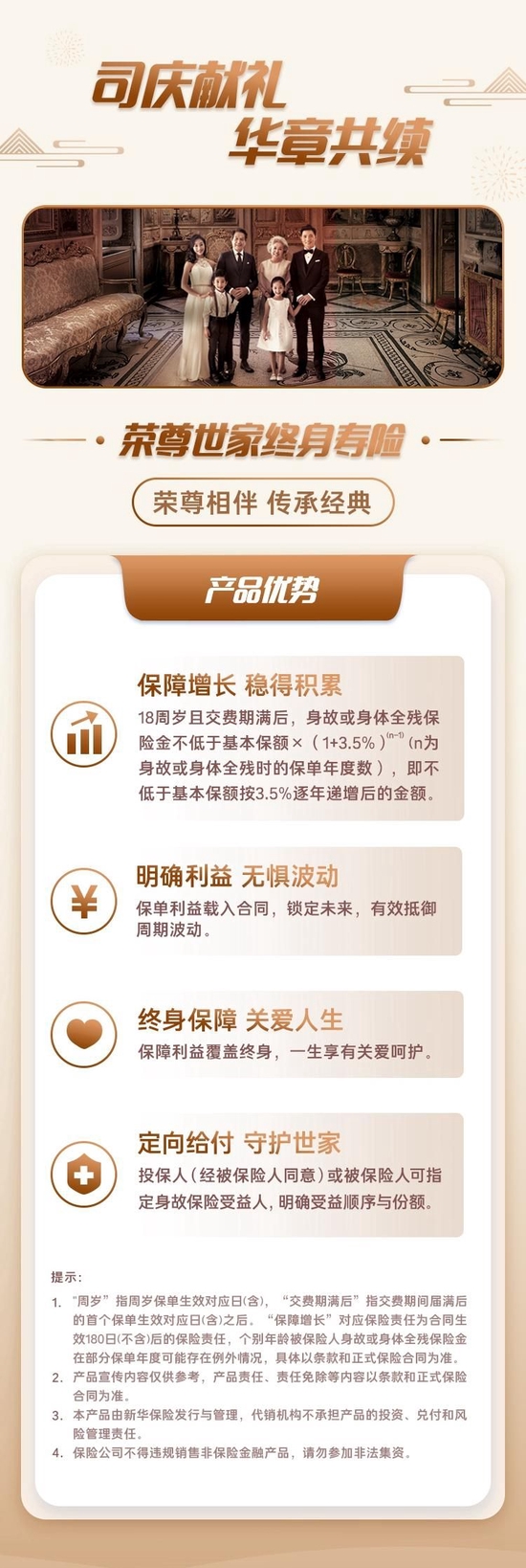 为更好地满足客户对资金规划的需求,新华保险自觉服务于党和国家“十四五”规划“满足人民日益增长的美好生活需要”、“扎实推动共同富裕”等要求,秉持“以客户为中心”的经营理念,隆重推出“荣尊世家终身寿险”。这是公司增额终身寿险产品体系的又一力作,在继承前作经典设计的基础上进一步提升保额递增比例,同时新增特定公共交通工具意外保障,向客户提供更加全面、优质的保障服务。