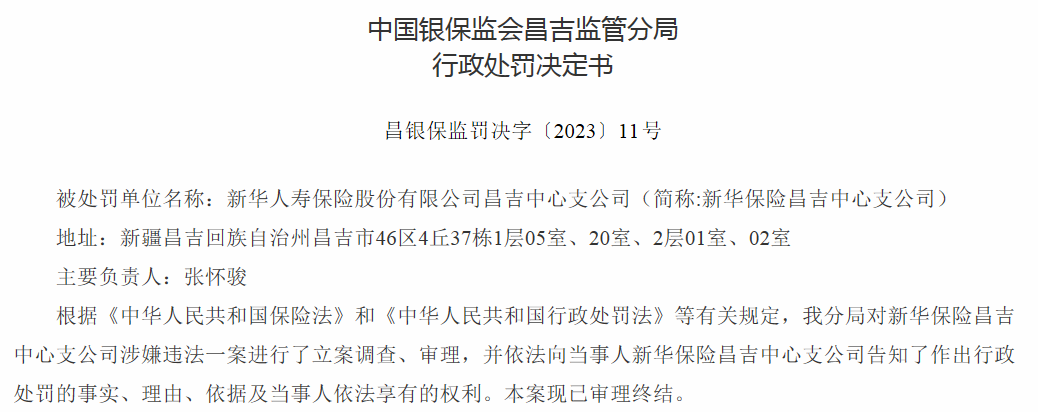 据国家金融监督管理总局,因产说会管理不到位,存在销售误导行为,新华保险昌吉中心支公司被罚8万。