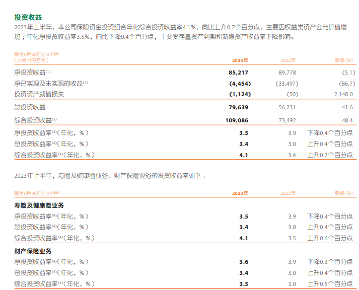其中寿险及健康险业务年化总投资收益率3.4%,上升0.4个百分点,年化净投资收益率3.5%,下降0.4个百分点。