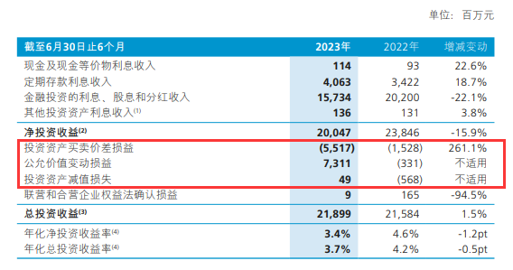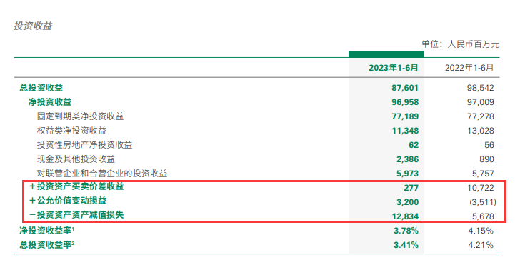 截至6月底,中国人寿投资资产达到5.42万亿,比2022年底增长7%。上半年净投资收益969.58亿,总投资收益为876.01亿。年化净投资收益率3.78%,下降0.37个百分点,年化总投资收益率3.41%,下降0.8个百分点。