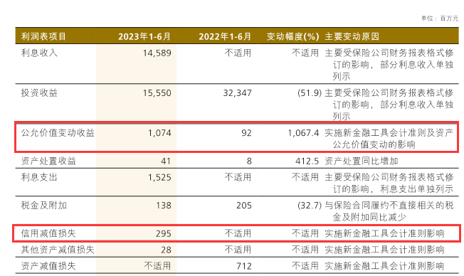 中国人保上半年财报执行新保险合同会计准则和新金融工具会计准则,金融资产减值计提由“已发生损失法”改为“预期信用损失法”,上半年信用减值损失为2.95亿,公允价值变动损益为10.74亿,以此推算,中国人保上半年“证券买卖价差收益”大约为23.45亿。