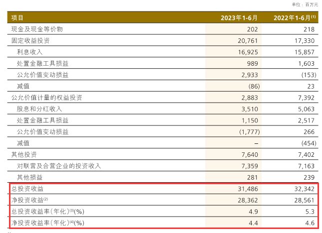 上半年净投资收益283.62亿,与去年同期基本持平,总投资收益314.86亿,下降2.65%。