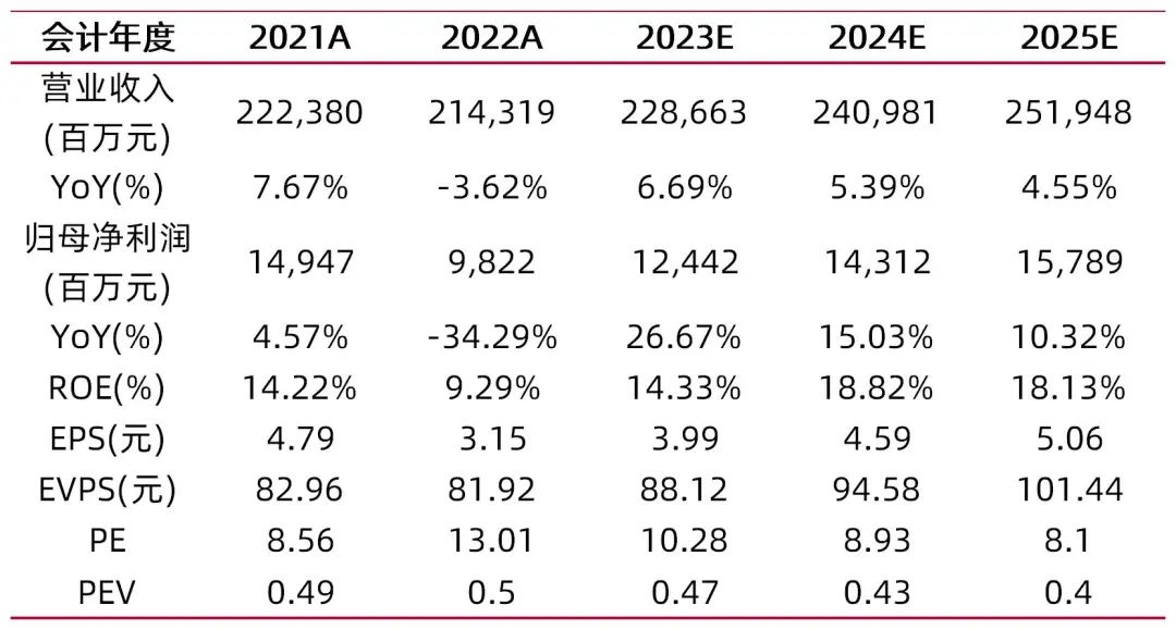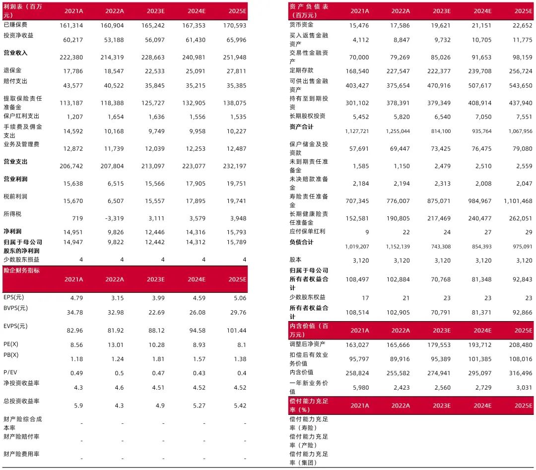 投资建议:根据中报,我们小幅下调了公司投资收益率假设,并基于此将2023-25年盈利预测下调11.3%、8.2%和8.0%。当前股价对应2023E P/EV 0.47x,略高于近5年合理估值区间下限。考虑到公司资产端弹性较高、负债端经营逐步改善且估值处于低位,维持“买入-B”评级。