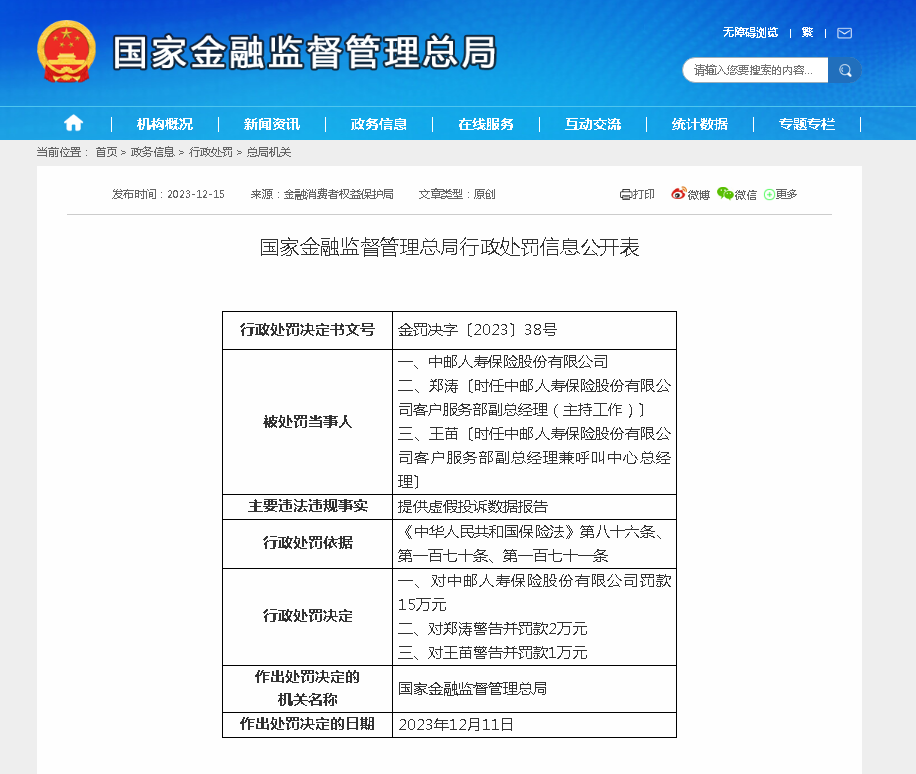 中邮、新华保险公司被国家金融监督管理总局行政处罚
